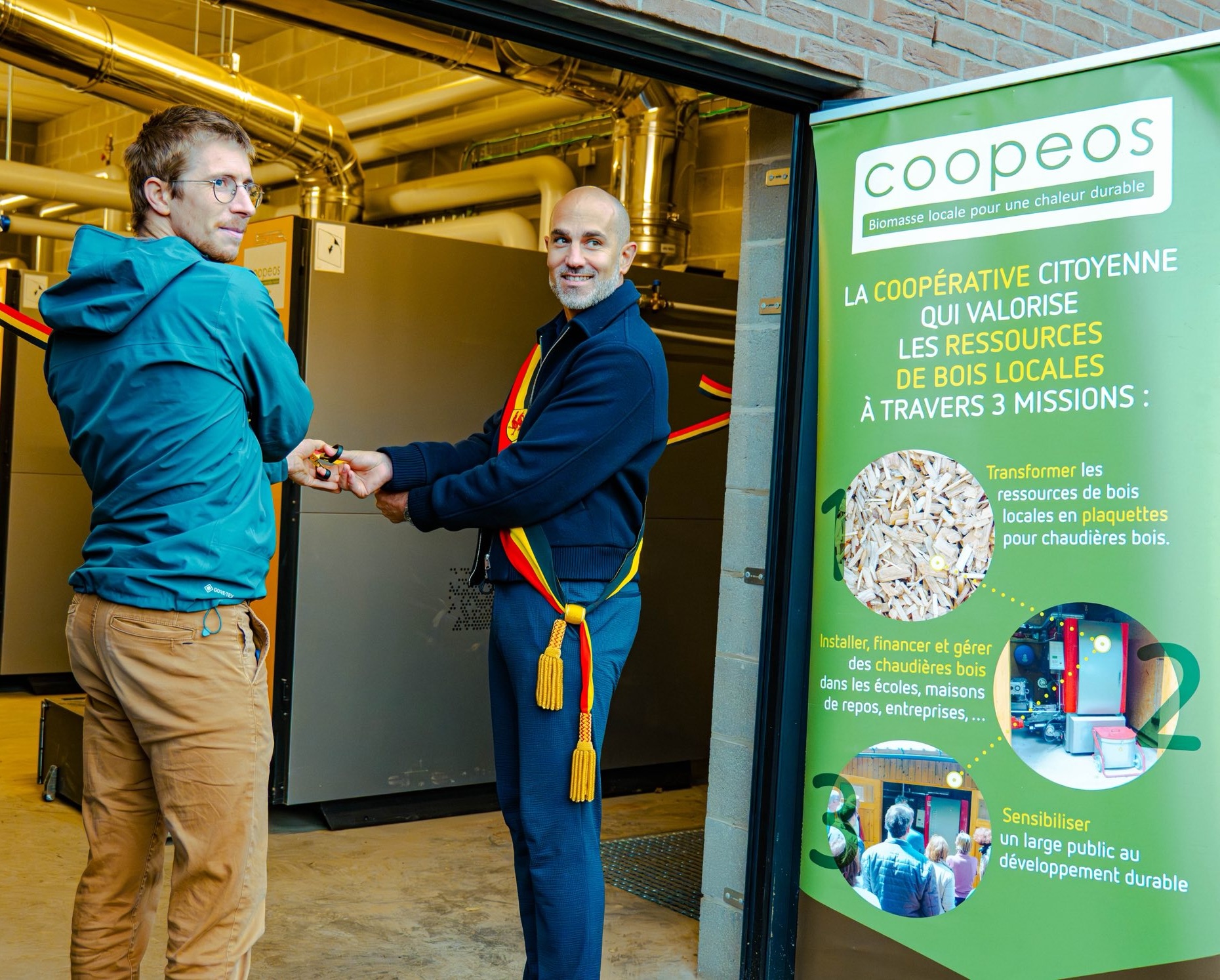 L’inauguration a rassemblé élus, membres de l’administration et riverains autour de ces deux projets. Après la visite de la place de Belle Maison, la foule s’est dirigée vers la chaufferie, où Joachim (notre responsable de projet) a coupé symboliquement le ruban avec le Bourgmestre Adrien Carlozzi.